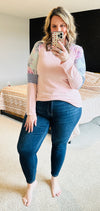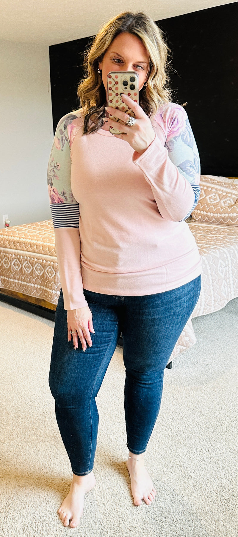 Our Alison Floral Colorblock top is designed with premium fabrics and exclusively manufactured in the USA. Featuring a soft knit material with great stretch, it is true to size with room to spare. A best seller, this top combines a leopard colorblock design with chic floral shoulders for a stylish look. Alyssa is wearing the small, Rachel is a size 14 wearing the XL.