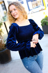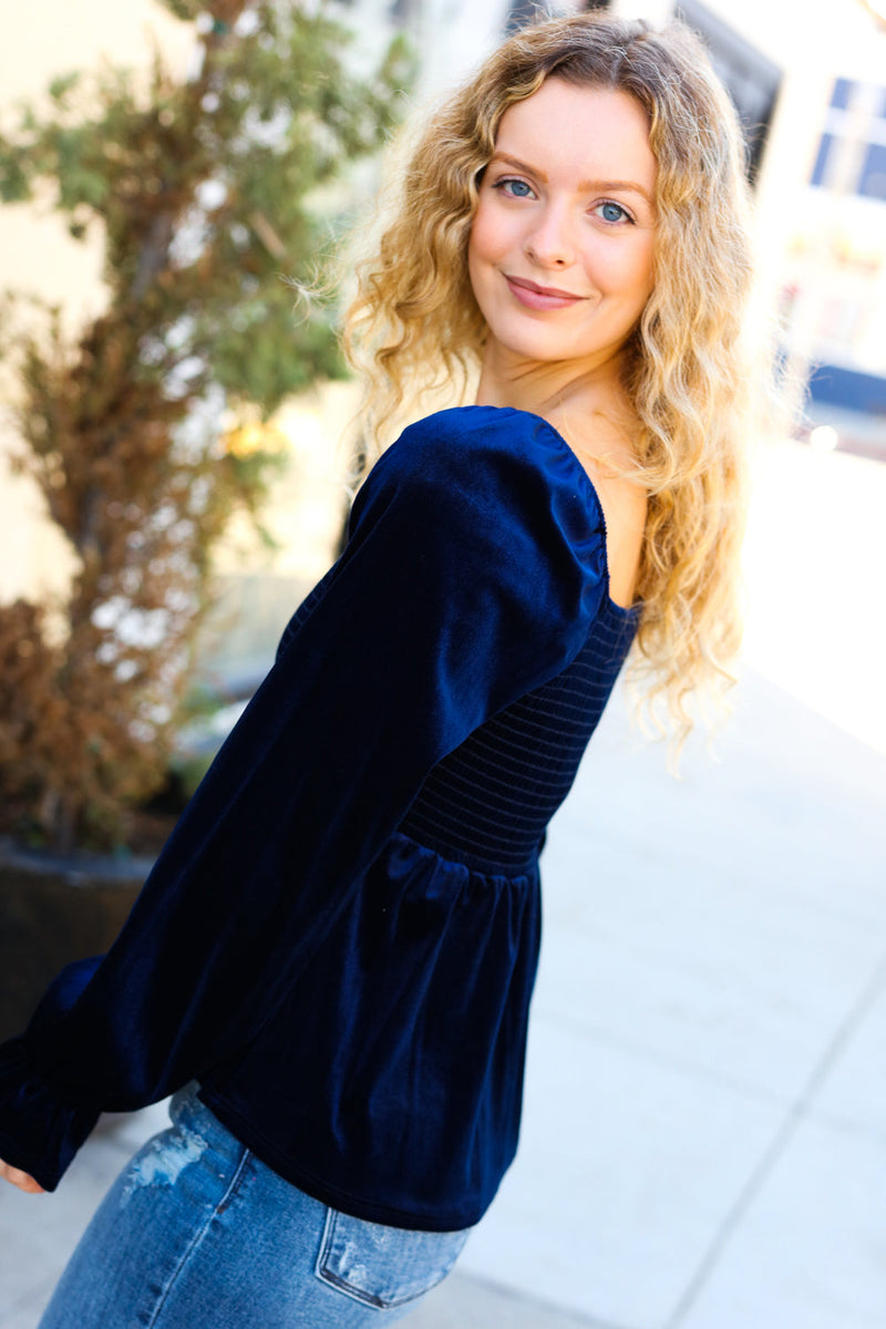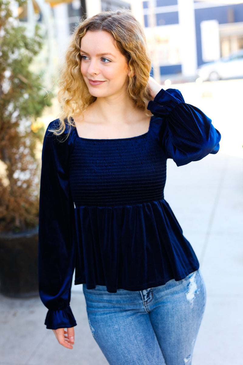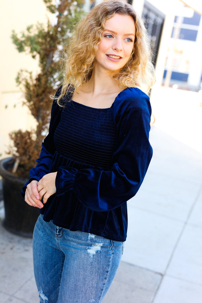 Shine Your Light Navy Crushed Velvet Smocked Ruffle Top