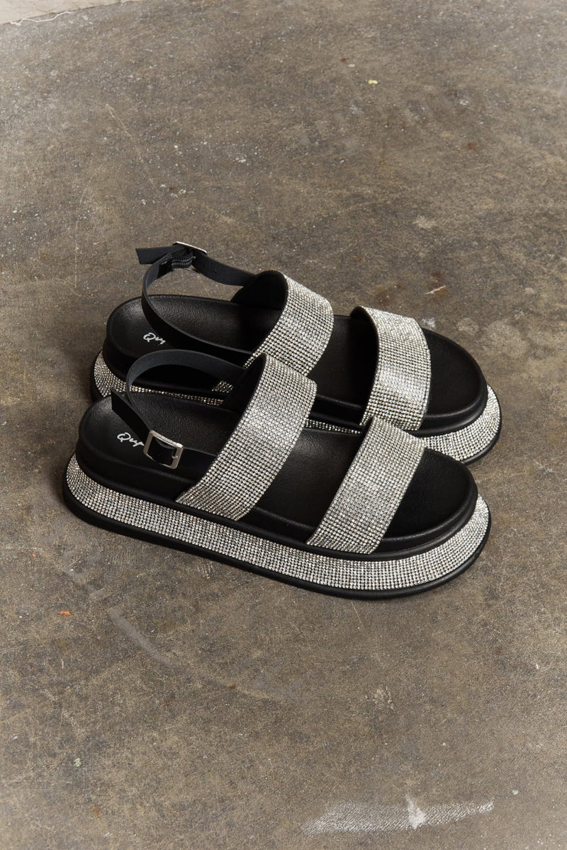 Elevate your footwear game with this dazzling flatform style, designed to add a touch of glamour to any outfit. The two bands of shimmering rhinestones create a captivating sparkle that will catch everyone's eye as you walk. With a secure and comfortable fit, thanks to the slingback strap, you can confidently step out in style all day long. Embrace the elegance and radiance of these sandals, perfect for any occasion where you want to shine and stand out from the crowd.