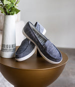 This Moc Canvas slip on sneaker has a round toe, elastic inserts for additional comfort and a canvas upper with a slight shimmer. Also available in red and tan.