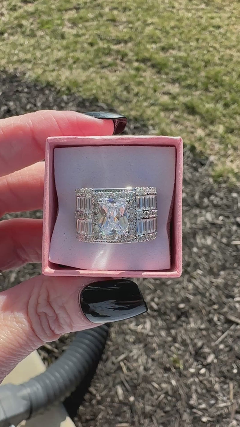The Lisa Art Deco Statement Ring channels vintage glamour with its striking geometric design. A brilliant princess-cut cubic zirconia center stone takes center stage, surrounded by a luminous halo and intricate rows of baguette and pavé-set stones that create dimensional sparkle from every angle. The wide silver-plated brass band delivers a luxurious, high-impact presence while maintaining the symmetrical elegance characteristic of Art Deco aesthetics. This expertly crafted piece is engineered to refract light beautifully, making it an ideal choice for those seeking a bold right-hand statement ring or a show-stopping focal point for any ensemble.