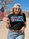 The word America in red metallic puff pressed onto a pattern of blue and white stars, and it is PRECIOUS!