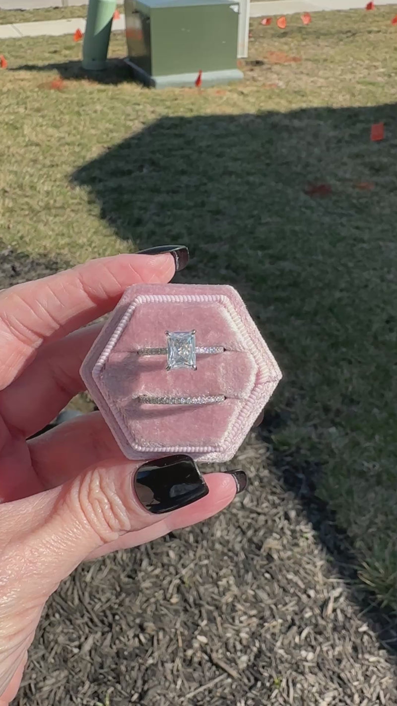 The Aria Luxe Radiant Ring Set blends timeless elegance with modern simplicity, creating a look that feels effortlessly refined. Featuring a brilliant radiant-cut center stone paired with a delicate coordinating band, this two-piece set offers beautiful sparkle while maintaining a clean, sophisticated silhouette. Wear the rings together for a classic, layered look or style each piece separately for everyday versatility. Crafted from silver-plated brass and finished with high-quality cubic zirconia stones, this set delivers a fine-jewelry inspired appearance while remaining lightweight and comfortable for all-day wear. Designed to elevate both casual and special occasion styling, the Aria Luxe Radiant Ring Set is a graceful, timeless addition to any jewelry collection.