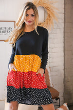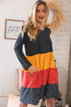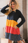 Black Floral Color Block Tiered Babydoll Midi Dress