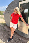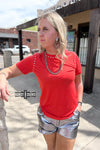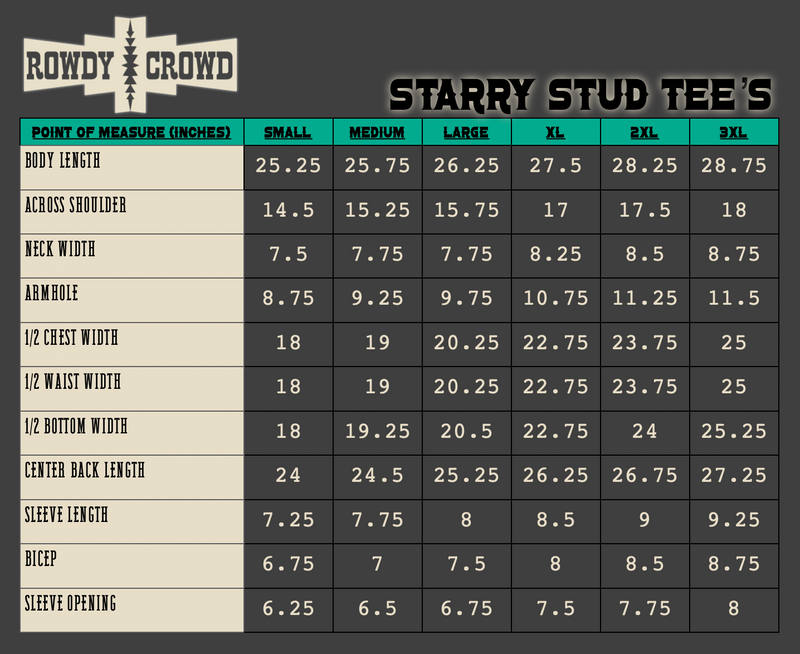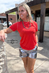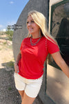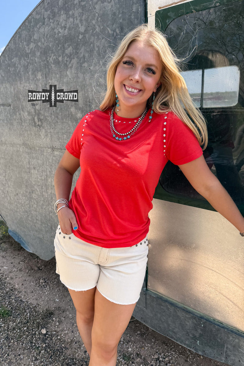 Want to add a bit of edge to your western style? Made from a vibrant, cherry red, comfortable material, this top features stunning studs around the neck and shoulders. The Starry Stud Tee is easy to dress up and down. Pair with a duster or by itself!
