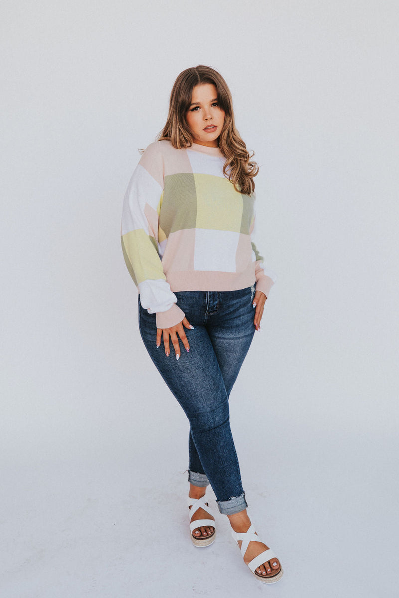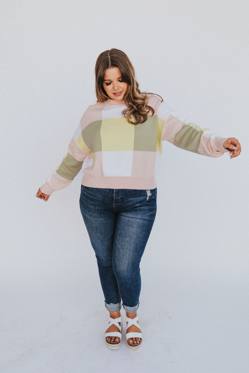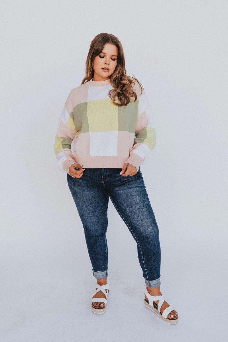 Get the look: Pair the It All Checks Out Color Block Sweater with the Situation Handled Tummy Control Jeans and your favorite shoes for the perfect outfit!