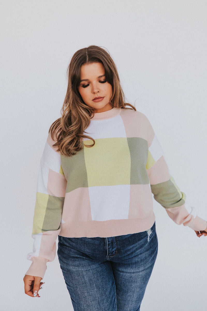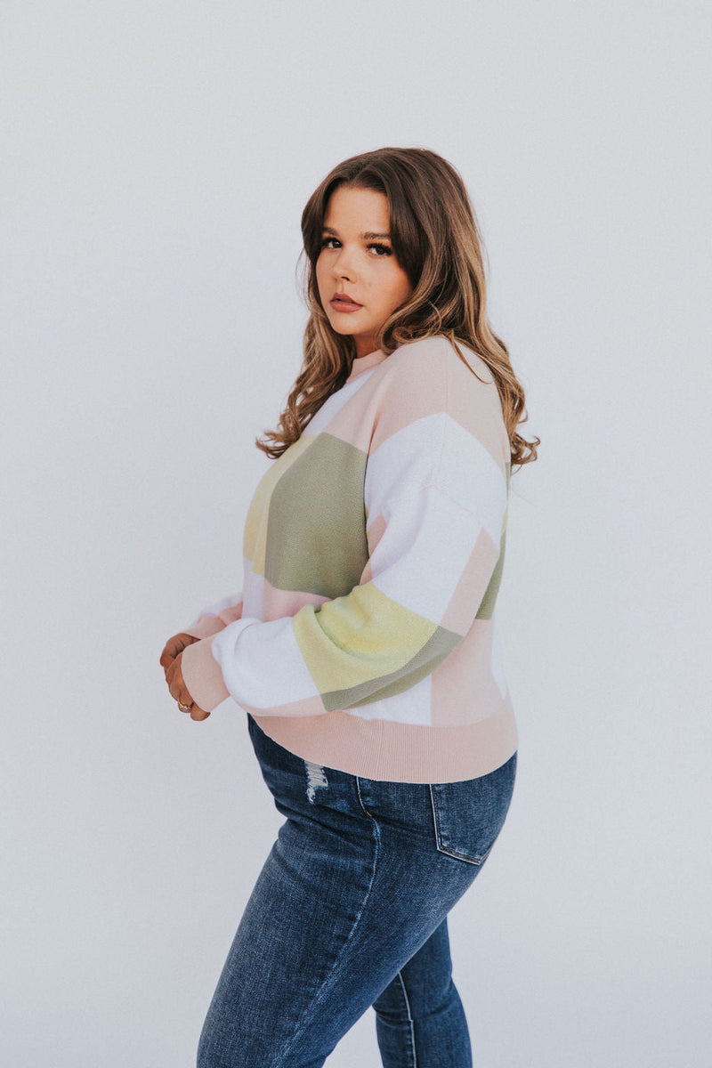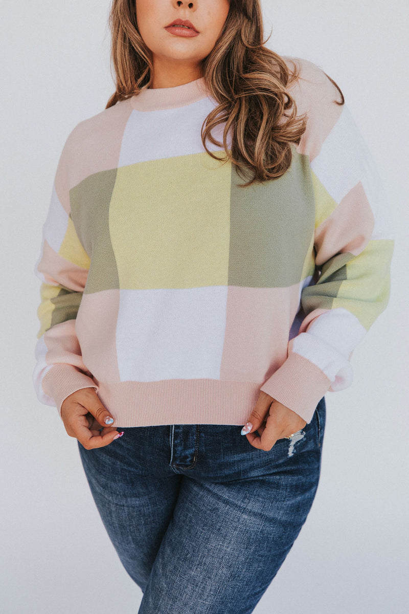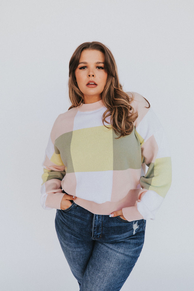 Everything you've heard about this sweater all checks out! It's so comfy and cozy and so darn cute! Featuring soft colors, high mock neckline, long sleeves and a color block design, this sweater is going to be an easy casual go-to top!
