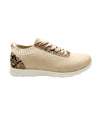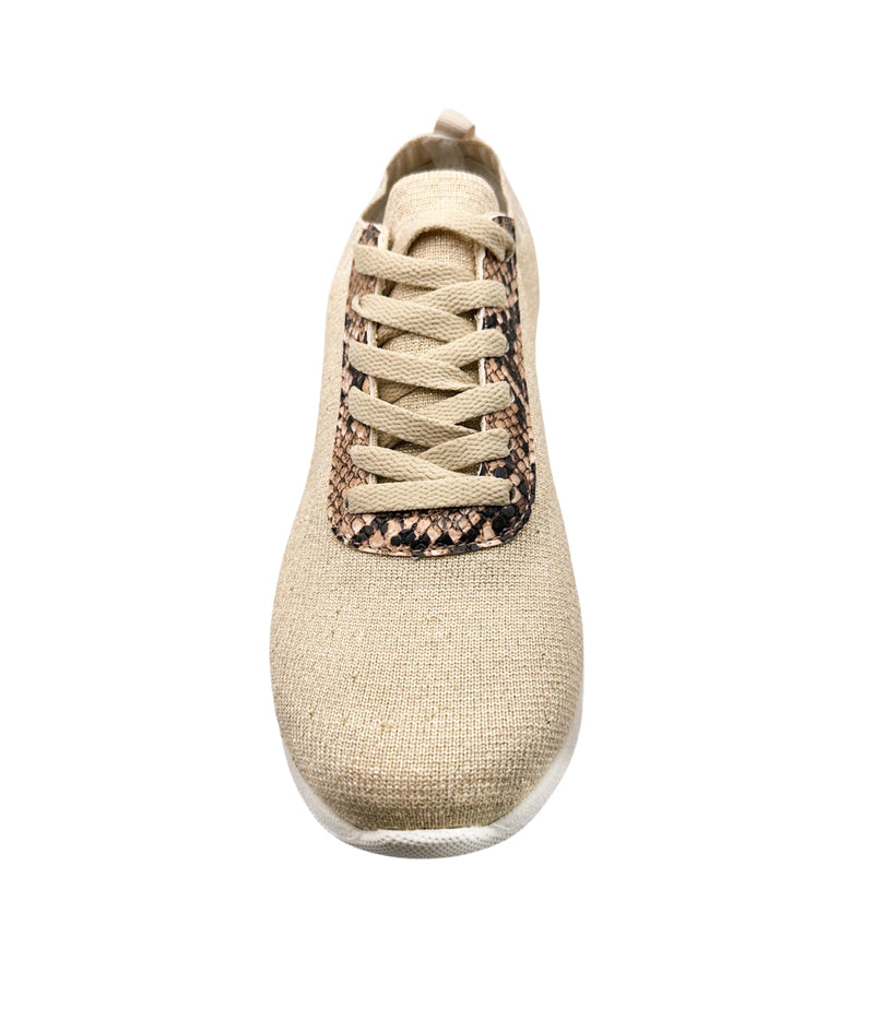 The Novah Sneaker features a fly-knit material upper that's blended with gold giving it a sparkle gleam. The lace stay and heel counter are trimmed in snake print material.