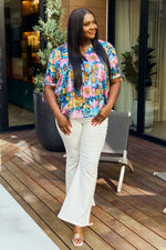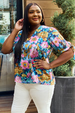 Add some floral fun to your closet with this blouse, designed with V-neck and short sleeves.
